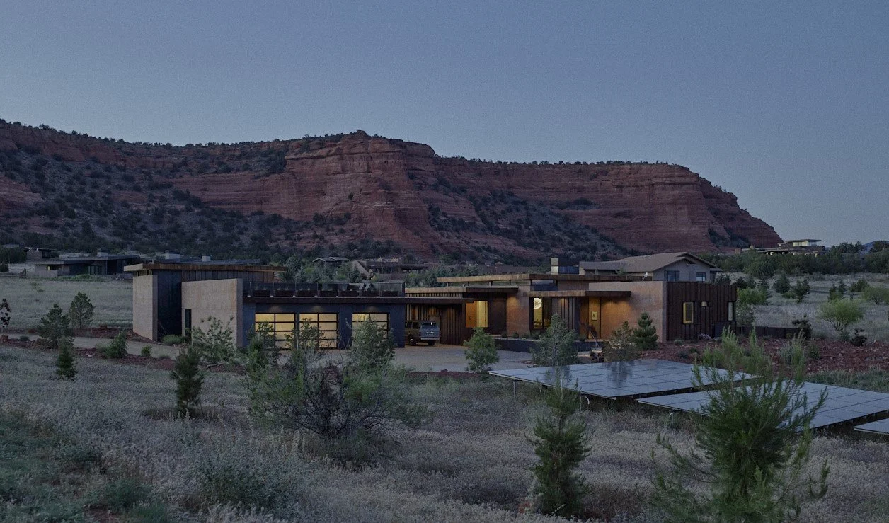Located on a 2.5 acre lot, the building exterior is defined by monolithic cast in place concrete walls and weathered corten siding. The chosen palette emulate the tones of the surrounding site. The interiors embody a blend of modern desert design with Japanese traditional interior elements; from an Ofuro room to two beautiful interior courtyards featuring Japanese maples and water features - the result is a modern retreat interwoven into the Sedona hillside.