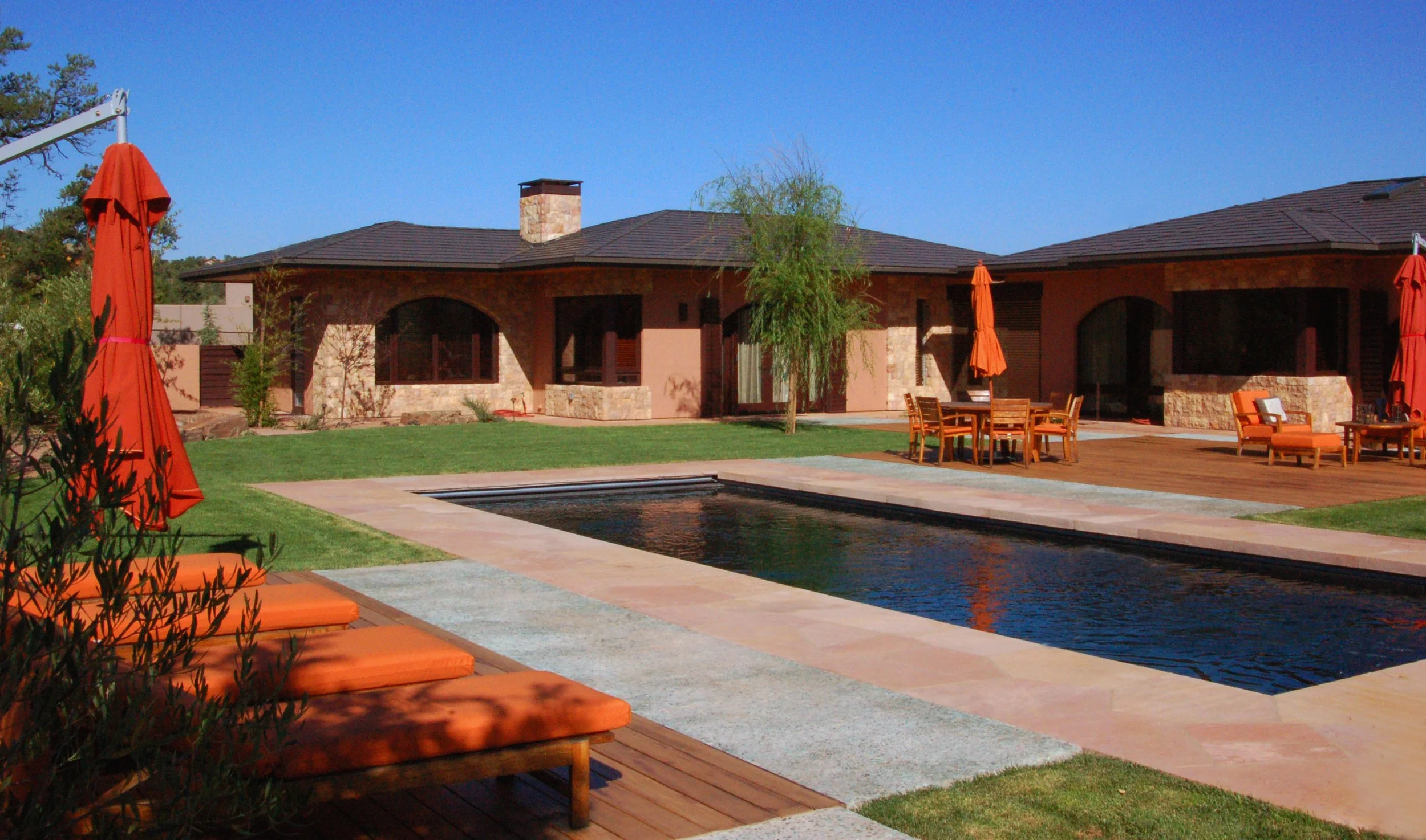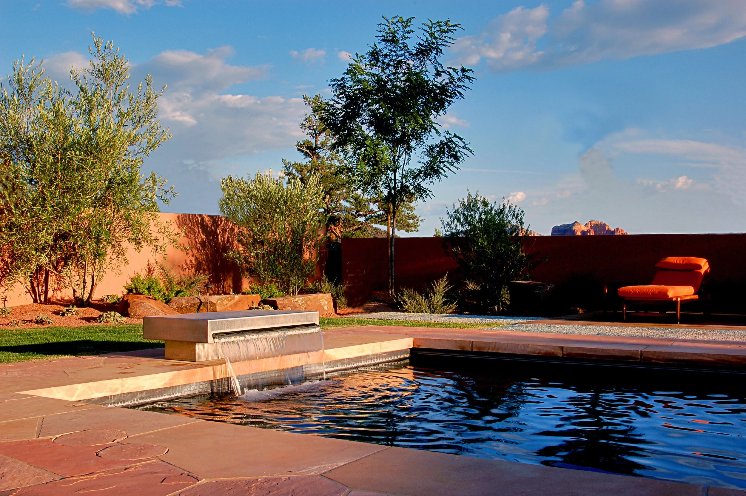 Located in the heart of Sedona with sweeping 360 degree views of the Red Rocks, this Italian Villa inspired residence encapsulates the whole site with beautiful indoor-outdoor spaces. Designed on a gated 1.7 acres lot, the property features a 1,000 square foot guest house and a 3,700 square feet main home. The exterior of the house features arched French doors, a natural stone veneer, and smooth finished stucco walls. Upon approaching the house, you are greeted by a custom design water feature that leads to the main entry door via a small bridge walking path over water lilies. The interior of the house was carefully designed and curated to meet the client specifications. Custom design cabinetry, Italian marble counter tops, custom American walnut wall paneling, and wide plank solid wood flooring bring another layer of sophistication to this custom home.